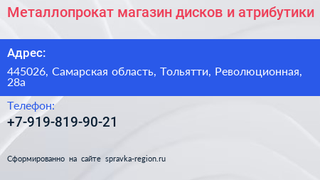 Металлопрокат, магазин дисков и атрибутики по адресу 445026, Самарская область, Тольятти, Революционная, 28а в дальнейшем Организация, размещена в следующих категориях: