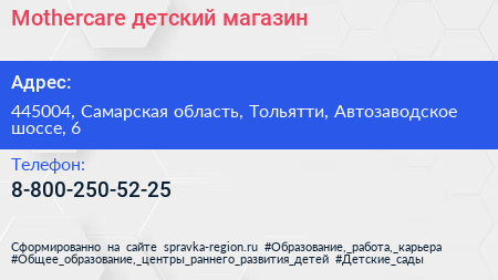 Mothercare, детский магазин по адресу 445004, Самарская область, Тольятти, Автозаводское шоссе, 6 в дальнейшем Организация, размещена в следующих категориях:
