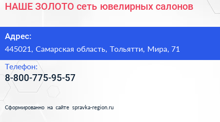 НАШЕ ЗОЛОТО, сеть ювелирных салонов по адресу 445021, Самарская область, Тольятти, Мира, 71 в дальнейшем Организация, размещена в следующих категориях: