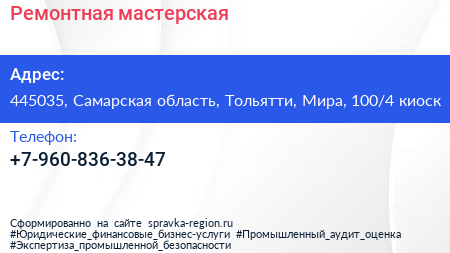 Ремонтная мастерская по адресу 445035, Самарская область, Тольятти, Мира, 100/4 киоск в дальнейшем Организация, размещена в следующих категориях:
