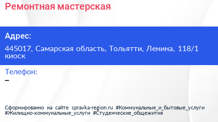Ремонтная мастерская по адресу 445017, Самарская область, Тольятти, Ленина, 118/1 киоск в дальнейшем Организация, размещена в следующих категориях: