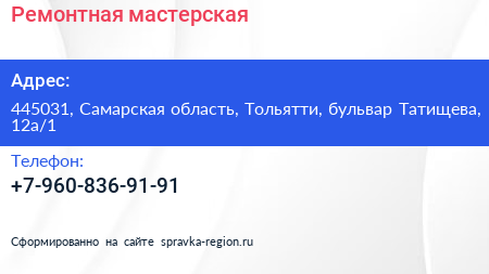 Ремонтная мастерская по адресу 445031, Самарская область, Тольятти, бульвар Татищева, 12а/1 в дальнейшем Организация, размещена в следующих категориях:
