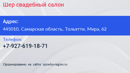 Шер, свадебный салон по адресу 445010, Самарская область, Тольятти, Мира, 62 в дальнейшем Организация, размещена в следующих категориях: