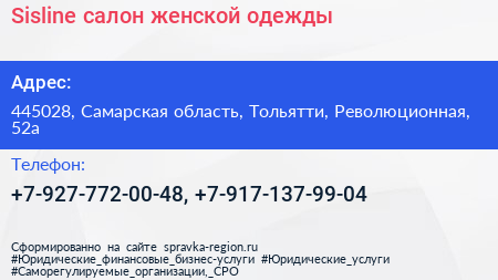 Sisline, салон женской одежды по адресу 445028, Самарская область, Тольятти, Революционная, 52а в дальнейшем Организация, размещена в следующих категориях: