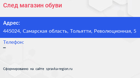 След, магазин обуви по адресу 445024, Самарская область, Тольятти, Революционная, 5 в дальнейшем Организация, размещена в следующих категориях: