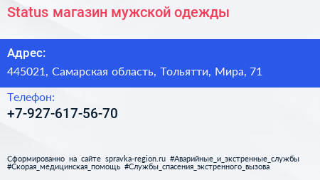 Status, магазин мужской одежды по адресу 445021, Самарская область, Тольятти, Мира, 71 в дальнейшем Организация, размещена в следующих категориях: