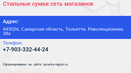 Стильные сумки, сеть магазинов по адресу 445026, Самарская область, Тольятти, Революционная, 28а в дальнейшем Организация, размещена в следующих категориях: