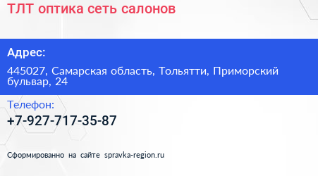 ТЛТ-оптика, сеть салонов по адресу 445027, Самарская область, Тольятти, Приморский бульвар, 24 в дальнейшем Организация, размещена в следующих категориях: