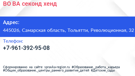 ВО!ВА!, секонд-хенд по адресу 445026, Самарская область, Тольятти, Революционная, 32 в дальнейшем Организация, размещена в следующих категориях: