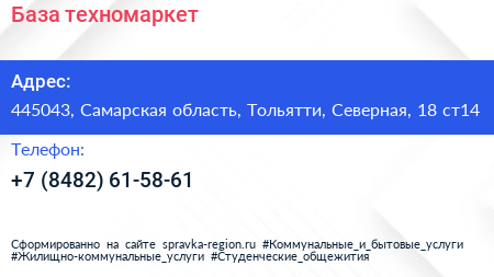 База, техномаркет по адресу 445043, Самарская область, Тольятти, Северная, 18 ст14 в дальнейшем Организация, размещена в следующих категориях: