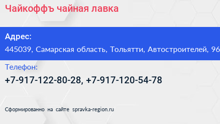 Чайкоффъ, чайная лавка по адресу 445039, Самарская область, Тольятти, Автостроителей, 96 в дальнейшем Организация, размещена в следующих категориях: