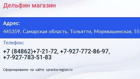 Дельфин, магазин по адресу 445359, Самарская область, Тольятти, Морквашинская, 55 в дальнейшем Организация, размещена в следующих категориях: