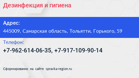 Дезинфекция и гигиена по адресу 445009, Самарская область, Тольятти, Горького, 59 в дальнейшем Организация, размещена в следующих категориях: