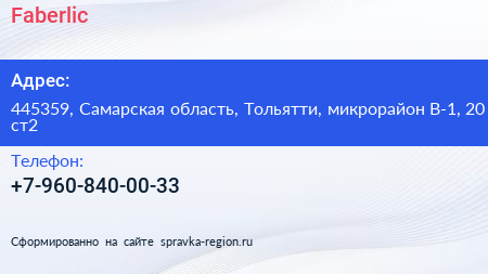 Faberlic по адресу 445359, Самарская область, Тольятти, микрорайон В-1, 20 ст2 в дальнейшем Организация, размещена в следующих категориях:
