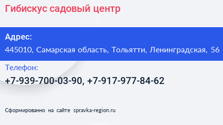 Гибискус, садовый центр по адресу 445010, Самарская область, Тольятти, Ленинградская, 56 в дальнейшем Организация, размещена в следующих категориях: