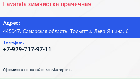 Lavanda, химчистка-прачечная по адресу 445047, Самарская область, Тольятти, Льва Яшина, 6 в дальнейшем Организация, размещена в следующих категориях: