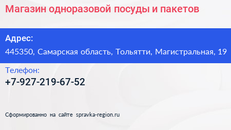 Магазин одноразовой посуды и пакетов по адресу 445350, Самарская область, Тольятти, Магистральная, 19 в дальнейшем Организация, размещена в следующих категориях:
