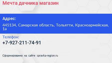 Мечта дачника, магазин по адресу 445134, Самарская область, Тольятти, Красноармейская, 1а в дальнейшем Организация, размещена в следующих категориях:
