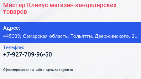 Мистер Клякус, магазин канцелярских товаров по адресу 445039, Самарская область, Тольятти, Дзержинского, 21 в дальнейшем Организация, размещена в следующих категориях: