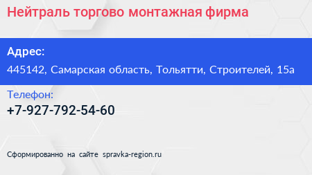 Нейтраль, торгово-монтажная фирма по адресу 445142, Самарская область, Тольятти, Строителей, 15а в дальнейшем Организация, размещена в следующих категориях: