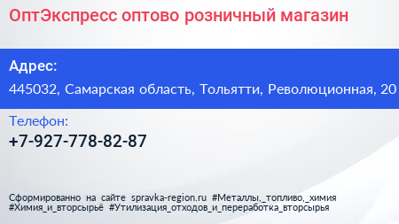 ОптЭкспресс, оптово-розничный магазин по адресу 445032, Самарская область, Тольятти, Революционная, 20 в дальнейшем Организация, размещена в следующих категориях: