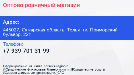 Оптово-розничный магазин по адресу 445027, Самарская область, Тольятти, Приморский бульвар, 22г в дальнейшем Организация, размещена в следующих категориях: