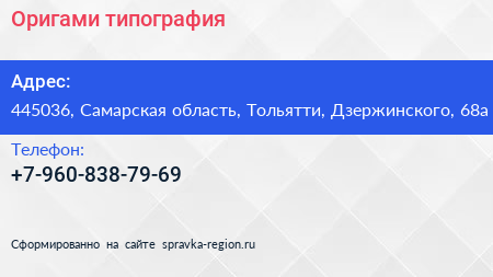 Оригами, типография по адресу 445036, Самарская область, Тольятти, Дзержинского, 68а в дальнейшем Организация, размещена в следующих категориях: