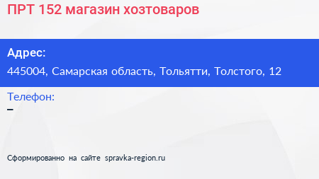 ПРТ № 152, магазин хозтоваров по адресу 445004, Самарская область, Тольятти, Толстого, 12 в дальнейшем Организация, размещена в следующих категориях: