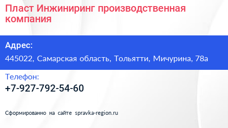 Пласт Инжиниринг, производственная компания по адресу 445022, Самарская область, Тольятти, Мичурина, 78а в дальнейшем Организация, размещена в следующих категориях: