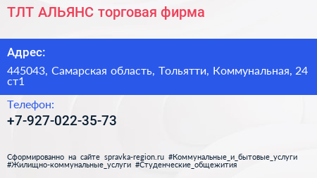 ТЛТ АЛЬЯНС, торговая фирма по адресу 445043, Самарская область, Тольятти, Коммунальная, 24 ст1 в дальнейшем Организация, размещена в следующих категориях: