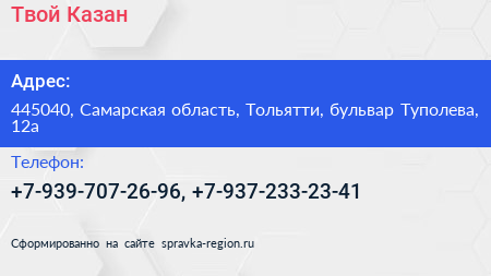 Твой Казан по адресу 445040, Самарская область, Тольятти, бульвар Туполева, 12а в дальнейшем Организация, размещена в следующих категориях: