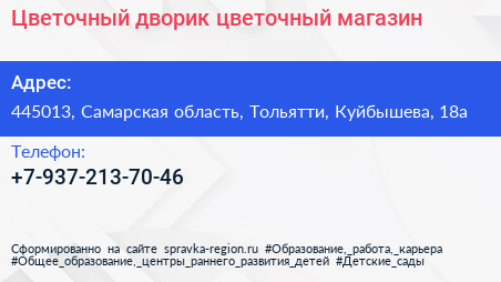 Цветочный дворик, цветочный магазин по адресу 445013, Самарская область, Тольятти, Куйбышева, 18а в дальнейшем Организация, размещена в следующих категориях: