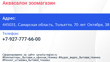 Аквасалон, зоомагазин по адресу 445031, Самарская область, Тольятти, 70 лет Октября, 38 в дальнейшем Организация, размещена в следующих категориях: