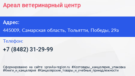 Ареал, ветеринарный центр по адресу 445009, Самарская область, Тольятти, Победы, 29а в дальнейшем Организация, размещена в следующих категориях: