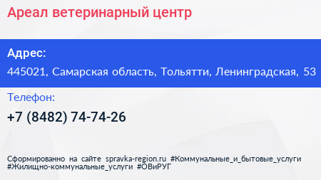 Ареал, ветеринарный центр по адресу 445021, Самарская область, Тольятти, Ленинградская, 53 в дальнейшем Организация, размещена в следующих категориях: