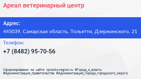 Ареал, ветеринарный центр по адресу 445039, Самарская область, Тольятти, Дзержинского, 21 в дальнейшем Организация, размещена в следующих категориях: