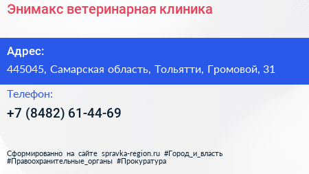 Энимакс, ветеринарная клиника по адресу 445045, Самарская область, Тольятти, Громовой, 31 в дальнейшем Организация, размещена в следующих категориях: