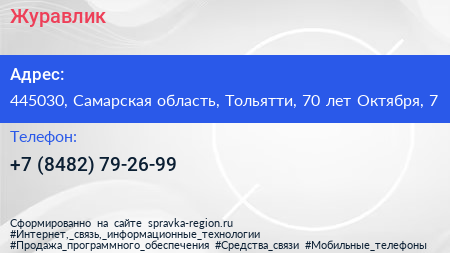 Журавлик по адресу 445030, Самарская область, Тольятти, 70 лет Октября, 7 в дальнейшем Организация, размещена в следующих категориях: