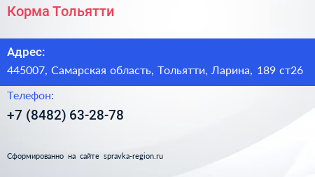 Корма Тольятти по адресу 445007, Самарская область, Тольятти, Ларина, 189 ст26 в дальнейшем Организация, размещена в следующих категориях: