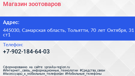 Магазин зоотоваров по адресу 445030, Самарская область, Тольятти, 70 лет Октября, 31 ст1 в дальнейшем Организация, размещена в следующих категориях: