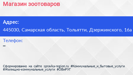 Магазин зоотоваров по адресу 445030, Самарская область, Тольятти, Дзержинского, 16а в дальнейшем Организация, размещена в следующих категориях: