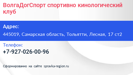 ВолгаДогСпорт, спортивно-кинологический клуб по адресу 445019, Самарская область, Тольятти, Лесная, 17 ст2 в дальнейшем Организация, размещена в следующих категориях: