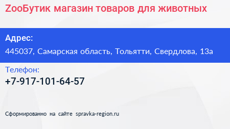 ZooБутик, магазин товаров для животных по адресу 445037, Самарская область, Тольятти, Свердлова, 13а в дальнейшем Организация, размещена в следующих категориях: