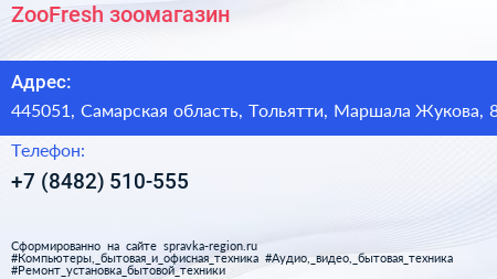 ZooFresh, зоомагазин по адресу 445051, Самарская область, Тольятти, Маршала Жукова, 8 в дальнейшем Организация, размещена в следующих категориях: