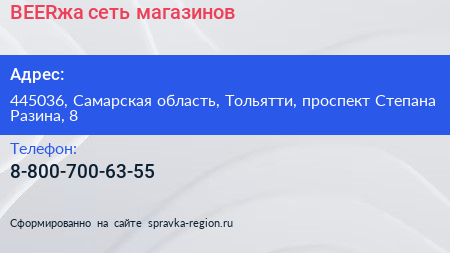 BEERжа, сеть магазинов по адресу 445036, Самарская область, Тольятти, проспект Степана Разина, 8 в дальнейшем Организация, размещена в следующих категориях:
