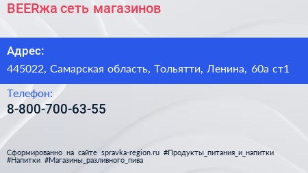 BEERжа, сеть магазинов по адресу 445022, Самарская область, Тольятти, Ленина, 60а ст1 в дальнейшем Организация, размещена в следующих категориях: