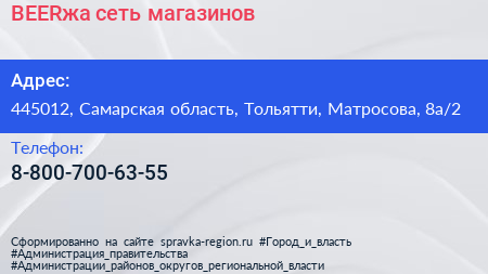 BEERжа, сеть магазинов по адресу 445012, Самарская область, Тольятти, Матросова, 8а/2 в дальнейшем Организация, размещена в следующих категориях:
