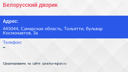 Белорусский дворик по адресу 445044, Самарская область, Тольятти, бульвар Космонавтов, 3а в дальнейшем Организация, размещена в следующих категориях: