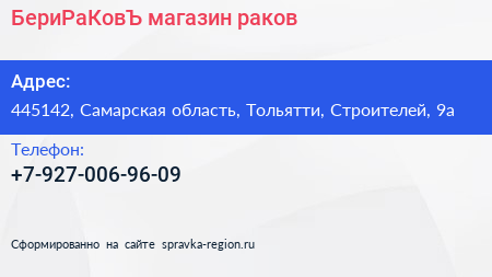 БериРаКовЪ, магазин раков по адресу 445142, Самарская область, Тольятти, Строителей, 9а в дальнейшем Организация, размещена в следующих категориях: