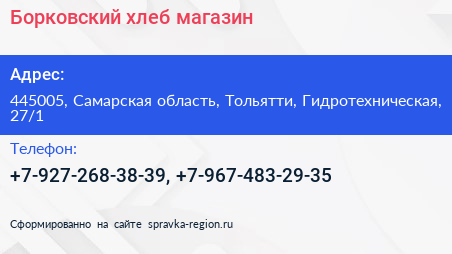 Борковский хлеб, магазин по адресу 445005, Самарская область, Тольятти, Гидротехническая, 27/1 в дальнейшем Организация, размещена в следующих категориях: